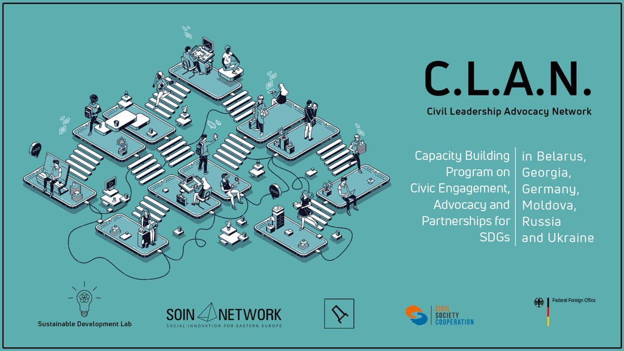Программа C.L.A.N. является частью проекта «Лаборатория устойчивого развития». С декабря 2020 г. по март 2021 г. участники будут делиться опытом и вырабатывать устойчивые подходы к управлению гражданскими проектами, онлайн-мероприятиями и международными программами. В десяти интерактивных модулях мы вместе с участниками обсудим проблемы, вызванные ограничениями, связанными с Covid-19, и попытаемся найти ответы на вопросы, касающиеся как текущей и будущей проектной работы, так и партнёрств: как мы можем эффективно работать вместе онлайн? Как мы можем укреплять наши партнерства, не встречаясь физически? Как нам оставаться видимыми и взаимодействовать с целевыми группами без офлайн-мероприятий? Как мы справляемся с проблемами цифровизации? Как мы можем интегрировать социальную и экологическую устойчивость в нашу работу?